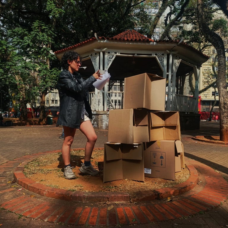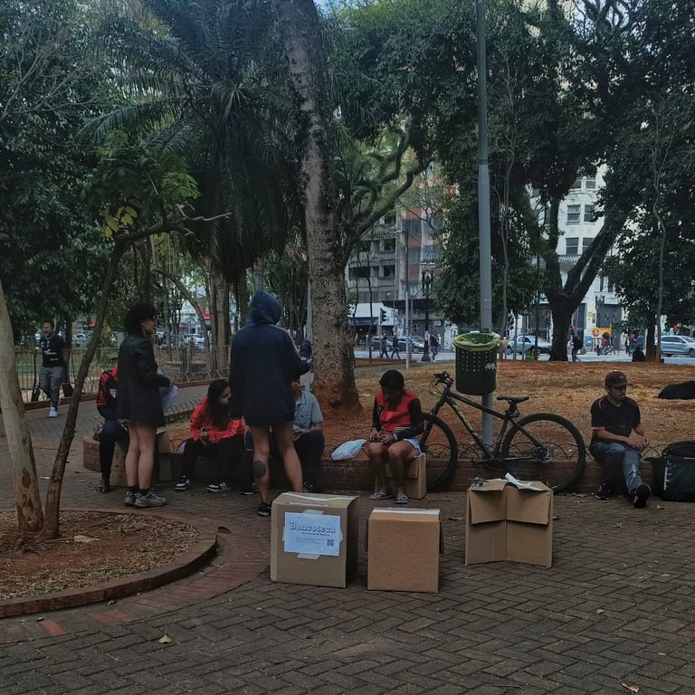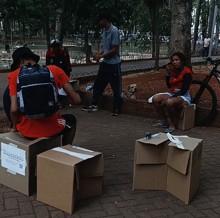 The Bancoteca, a project I developed during my residency at Praça da República in São Paulo. One of the oldest squares in the city, once had benches for sitting, but they were replaced by ones with hostile architecture in 2007, only to be removed later, leaving the square without a place to enjoy the space. The Bancoteca is made up of benches made from cardboard boxes and tape, along with a fanzine that shows the step-by-step process for building one. Once used to the point of wear, the bench is recycled by people who make a living from this work.