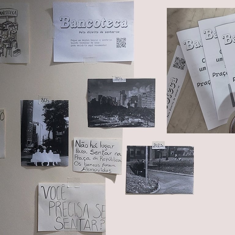 La Bancoteca, un proyecto que desarrollé durante mi residencia en Praça da República - São Paulo. Una de las plazas más antiguas de la ciudad que tuvo bancas para sentarse pero fueron reemplazadas por unas con arquitectura hostil en el 2007, para posteriormente ser retiradas y dejar la plaza sin un lugar para disfrutar el espacio. La Bancoteca se compone de bancos armados con cajas de cartón y cinta además de un fanzine que enseña el paso a paso para construir uno, una vez usado hasta desgastarse, el banco es reciclado por personas que viven de este trabajo.
